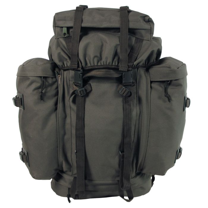 Туристическа многофункционална раница Mountain OD Green от германската фирма MFH. Раницата е с капацитет 80л.+20л., изработена е от 100% полиестер. Оборудвана е с алуминиева стабилизираща рамка (самар), която може да се демонтира. Разполага с Vario-back-система - регулируема по височина , което е допълнително предимство особено при по-тежки товари. Презрамките и гърбът са подплатени, което създава допълнителен комфорт. Основното отделение е разделено на две части с отваряща се клапа, която открива в долната част двойно дъно за замърсени дрехи. Отпред са разположени четири броя карго ремъци за външен допълнителен товар. Страничните джобове са закрепени с по два броя двупосочни ципове, велкро ленти и ремъци. Ремъците може да бъдат монтирани само на единия джоб и по този начин да се получи една малка 10 литрова раничка. Циповете им може да бъдат съединени и да се получи и 20 литрова раничка, на която може да се монтира и допълнителен товар. Раницата е изключително функционална и предлага на потребителите възможността да имат раница с различна вместимост.