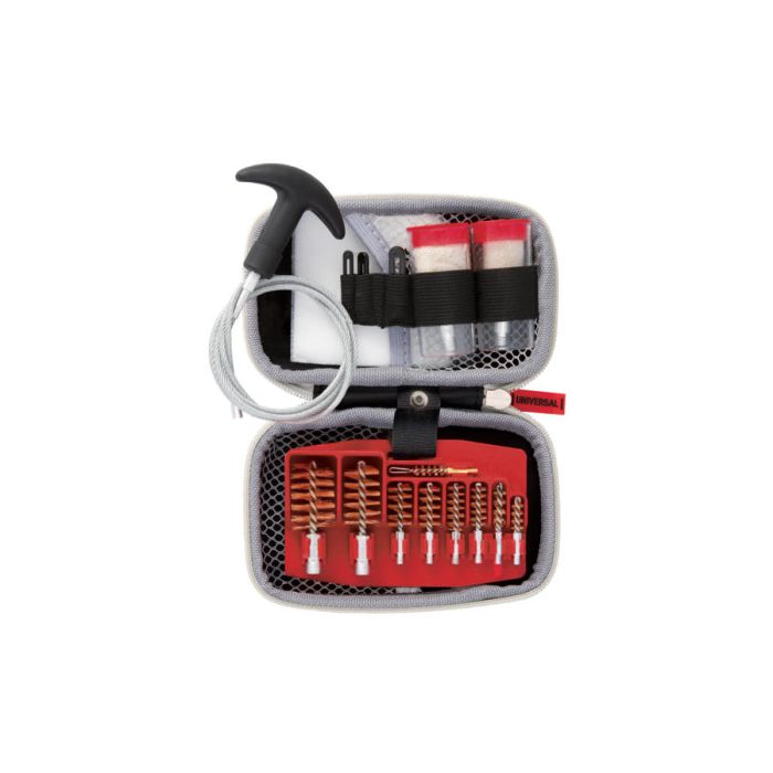Спецификации: Стоманено въже за карабини/пушки Стоманено въже за късо оръжие Фосфор-бронзова четка за .270 до .280/7mm Фосфор-бронзова четка за .22 до .223/5.56mm Фосфор-бронзова четка за .22 cal. short-action Фосфор-бронзова четка за 20 & 12 ga. Фосфор-бронзова четка за .45 cal. Фосфор-бронзова четка за .357/.38/9mm Фосфор-бронзова четка за .30 cal. Фосфор-бронзова четка с уше за .17 cal. Памучно кече за 20 & 12 ga. Малки почистващи тампончета 25бр. Големи почистващи тампончета 25бр. Три найлонови накрайника с ушета за дълго и късо оръжие Големи и малки адаптери с резба Т-ръкохватка